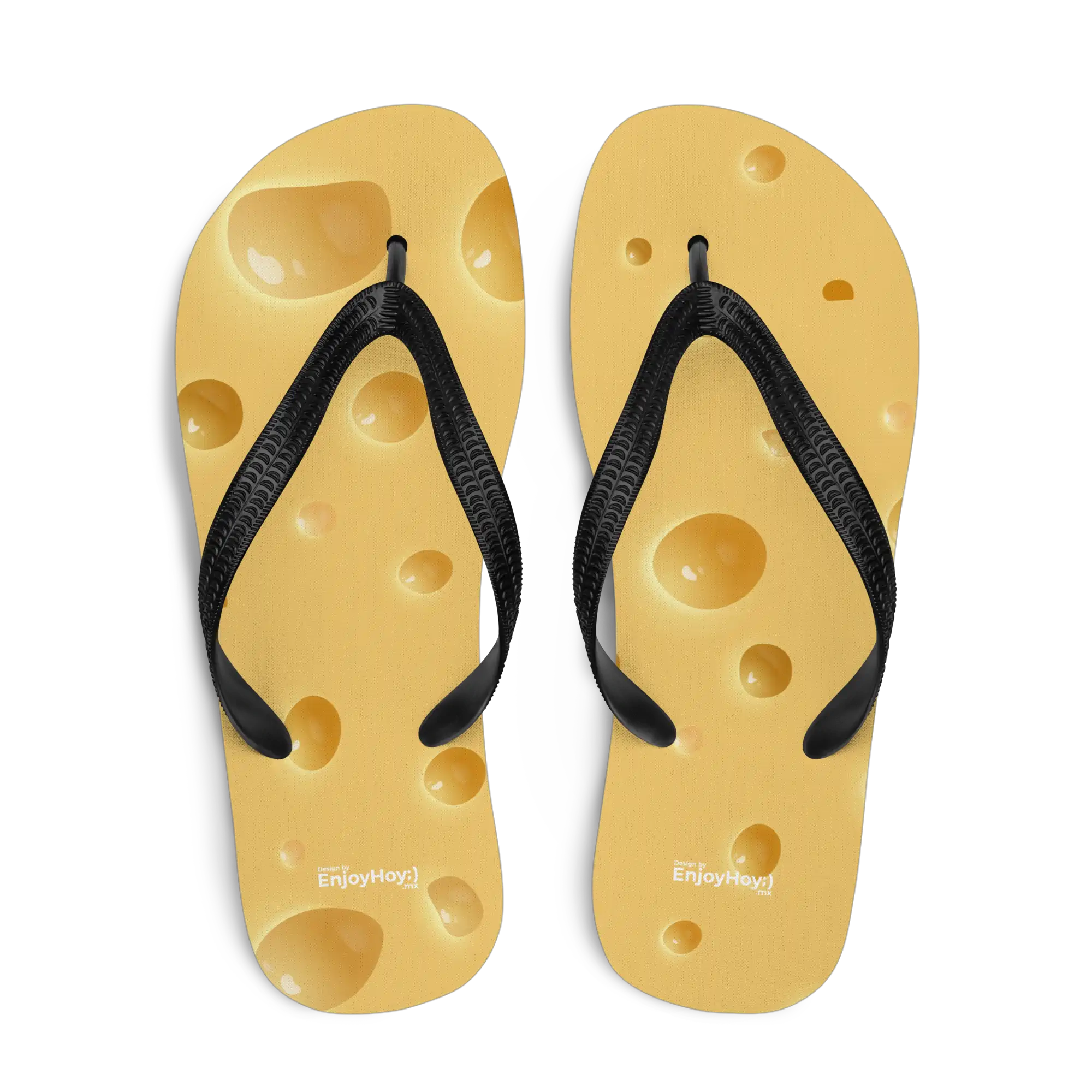 Estas chanclas están hechas con suela de goma resistente y una superficie de poliéster que lleva impreso un diseño realista de queso gruyere. Sí, ese mismo queso con agujeros que incluso la ciencia aún estudia por sus misteriosos hoyitos. ¿La diferencia? Aquí los agujeros los llevas en los pies, pero con estilo.